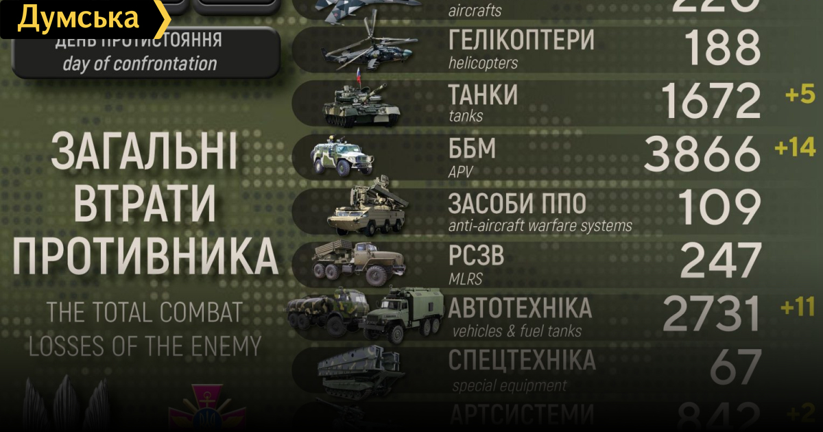 Сили оборони за добу знищили ворожий літак, п'ять танків та 14 бойових броньованих машин (інфографіка)
