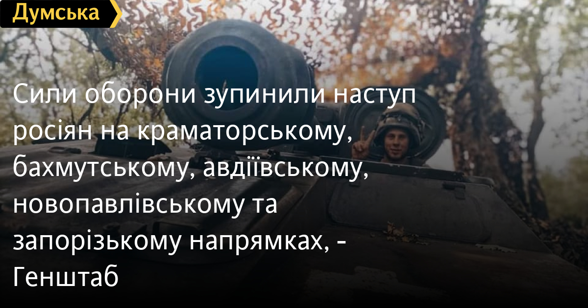 Сили оборони зупинили наступ росіян на краматорському, бахмутському, авдіївському, новопавлівському та запорізькому напрямках, — ГенштабСпроби окупантів наступати на краматорському, бахмутському, авдіївському, новопавлівському та запорізькому напрямках були провальними. Про це повідомляє Генеральний штаб Збройних сил України у ранковому зведенні. У краматорському напрямку російські нацисти безуспішно атакували в районі Миколаївки — Виїмки, в результаті відійшли. На бахмутському напрямі загарбники наступали біля Володимирівки – Соледара, Покровського – Бахмутського, Покровського – Бахмута, Клиново – Бахмута, Семигір'я – Зайцево, Семигір'я – Кодеми та Гольмівського – Зайцево. У всіх випадках Сили оборони змусили російських нацистів відійти з втратами. Те саме трапилося на авдіївському напрямку в районі Лозового – Первомайського та на новопавлівському та запорізькому недалеко від Єгорівки – Шевченка. СМЕРТЬ РОСІЙСЬКИМ ОКУПАНТАМ! Помітили помилку? Виділяйте слова з помилкою та натискайте control-enter |