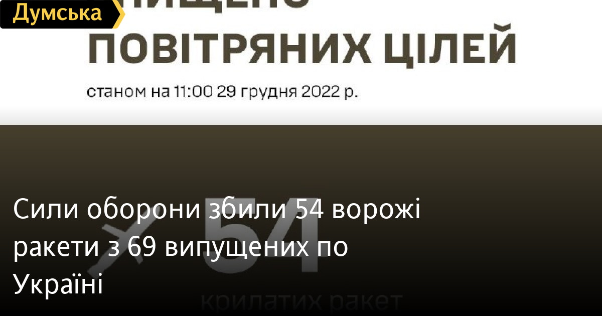 54 ворожі крилаті ракети з 69, випущених ворогом вранці 29 грудня по території України, збили Сили оборони.