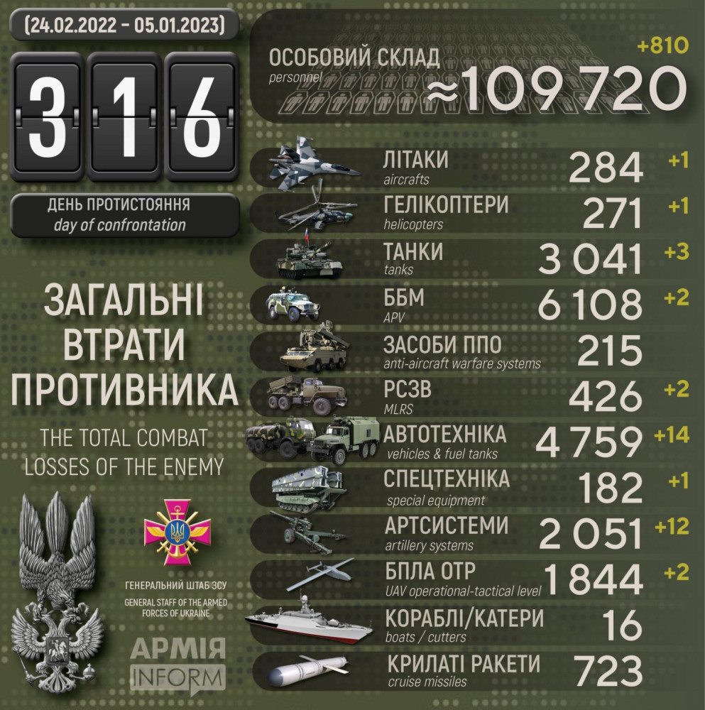 Силы обороны сбили вражеские самолет и вертолет и уничтожили 810 россиян за сутки (инфографика)Самолет и вертолет врага, а также 810 оккупантов уничтожили за минувшие сутки Силы обороны Украины. Об этом сообщили в Генеральном штабе Вооруженных сил. Также противник потерял три танка, две боевые бронемашины, двенадцать артсистем и две реактивные системы залпового огня, два дрона оперативно-тактического уровня и 14 единиц автомобильной техники и автоцистерн и еще одну — спецтехники. Всего с начала полномасштабной войны украинские защитники уничтожили примерно: личного состава — около 109720 (+810) человек ликвидировано, танков — 3041 (+3) ед, боевых бронированных машин — 6108 (+2) ед, артиллерийских систем — 2051 (+12) ед, РСЗО — 426 (+2) ед, средства ПВО - 215 (+0) ед, самолетов — 284 (+1) ед, вертолетов — 271 (+1) ед, БПЛА оперативно-тактического уровня — 1844 (+2), крылатые ракеты — 723 (+0), корабли / катера — 16 (+0) ед, автомобильной техники и автоцистерн — 4759 (+14) ед, специальная техника — 182 (+1). СМЕРТЬ РОССИЙСКИМ ОККУПАНТАМ! Заметили ошибку? Выделяйте слова с ошибкой и нажимайте control-enter |