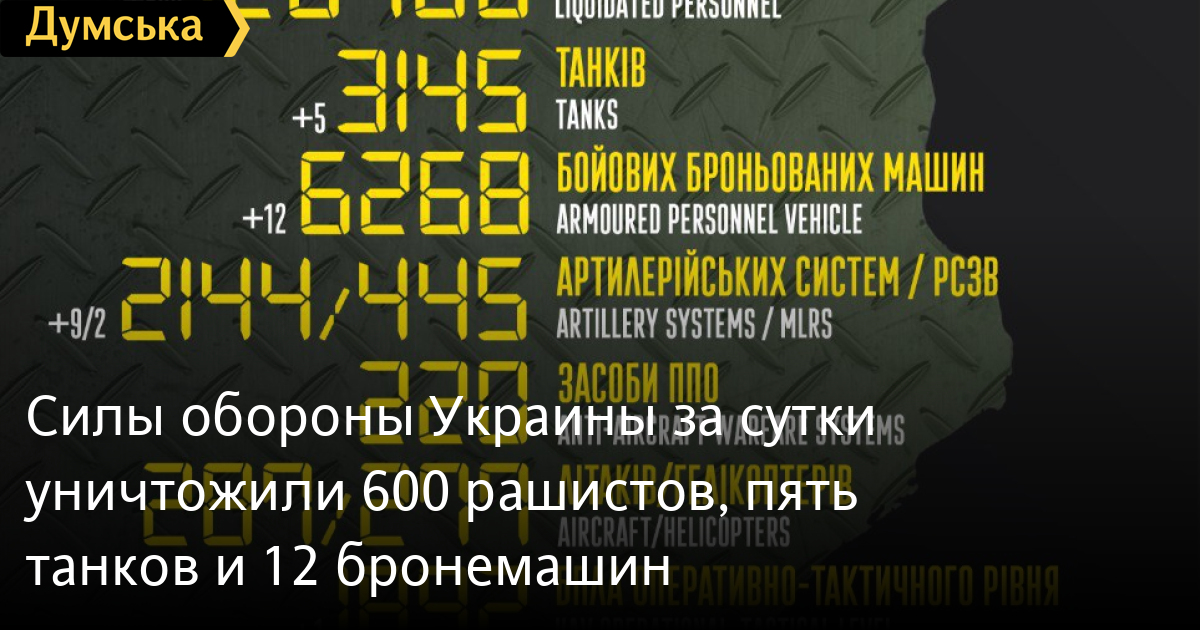 Силы обороны Украины за сутки уничтожили 600 рашистов, пять танков и 12 бронемашинЕще 600 оккупантов были демилитаризированы и денацифицированы в Украине 21 января. С 24 февраля 2022 года эту процедуру прошли уже не менее 120760 российских солдат и офицеров. В Генеральном штабе Вооруженных сил Украины сообщили, что также были уничтожены пять вражеских танков (3145 за все время), 12 боевых бронированных машин (6268), девять артиллерийских систем (2144), две реактивные системы залпового огня (445) и 14 грузовиков (4932). Сбит беспилотник оперативно-тактического уровня (1892). СМЕРТЬ РОССИЙСКИМ ОККУПАНТАМ! Заметили ошибку? Выделяйте слова с ошибкой и нажимайте control-enter |