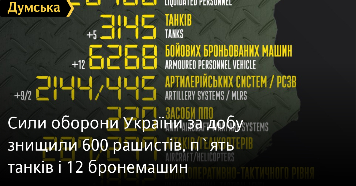 Сили оборони України за добу знищили 600 рашистів, п`ять танків і 12 бронемашинЩе 600 окупантів було демілітаризовано та денацифіковано в Україні 21 січня. З 24 лютого 2022 року цю процедуру пройшли вже щонайменше 120760 російських солдатів і офіцерів. У Генеральному штабі Збройних сил України повідомили, що також було знищено п'ять ворожих танків (3145 за весь час), 12 бойових броньованих машин (6268), дев'ять артилерійських систем (2144), дві реактивні системи залпового вогню (445) і 14 вантажівок (4932). Збито безпілотник оперативно-тактичного рівня (1892). СМЕРТЬ РОСІЙСЬКИМ ОКУПАНТАМ! Помітили помилку? Виділяйте слова з помилкою та натискайте control-enter |
