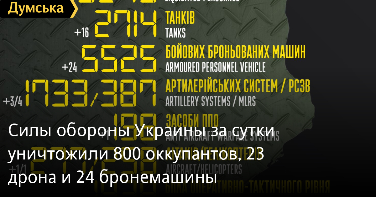 Сили оборони України за добу знищили 800 окупантів, 23 дрони та 24 бронемашини800 російських нацистів знищили українські воїни 1 листопада. З початку повномасштабної війни ворожі втрати вже становлять 73 270 солдатів і офіцерів. Про це повідомили у Генеральному штабі Збройних сил України. Також учора наші захисники підбили 16 танків (2714), 24 бронемашини (5525), три артилерійські системи (1733), чотири реактивні системи залпового вогню (387), одну установку ППО (198) та 10 вантажівок (4153). Збито один літак (277) і один вертоліт (258), а також 23 дрони (1438). СМЕРТЬ РОСІЙСЬКИМ ОКУПАНТАМ! Помітили помилку? Виділяйте слова з помилкою та натискайте control-enter |