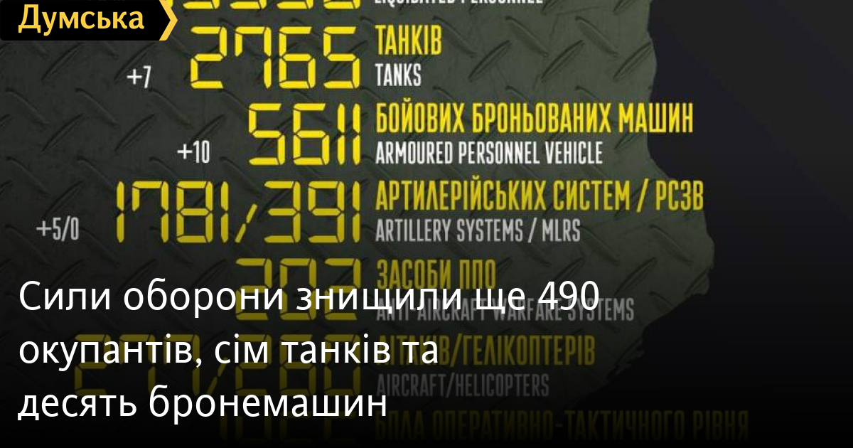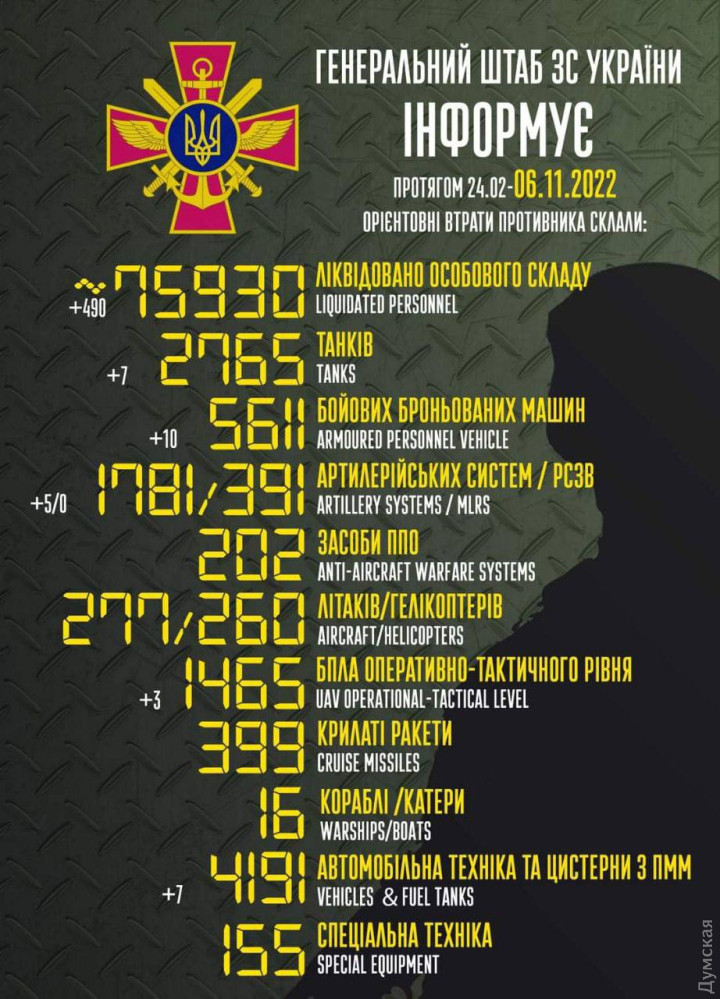 Сили оборони знищили ще 490 окупантів, сім танків та десять бронемашинУкраїнські війська 5 листопада знищили 490 російських загарбників. З початку повномасштабної війни втрати окупантів склали вже 75 930 солдатів і офіцерів. За даними Генерального штабу Збройних сил України, вчора було підбито сім ворожих танків (2765), десять бронемашин (5611), п'ять артилерійських систем (1781) та сім вантажівок (4191). Було збито три безпілотники оперативно-тактичного рівня (1465). СМЕРТЬ РОСІЙСЬКИМ ОКУПАНТАМ! Помітили помилку? Виділяйте слова з помилкою та натискайте control-enter |