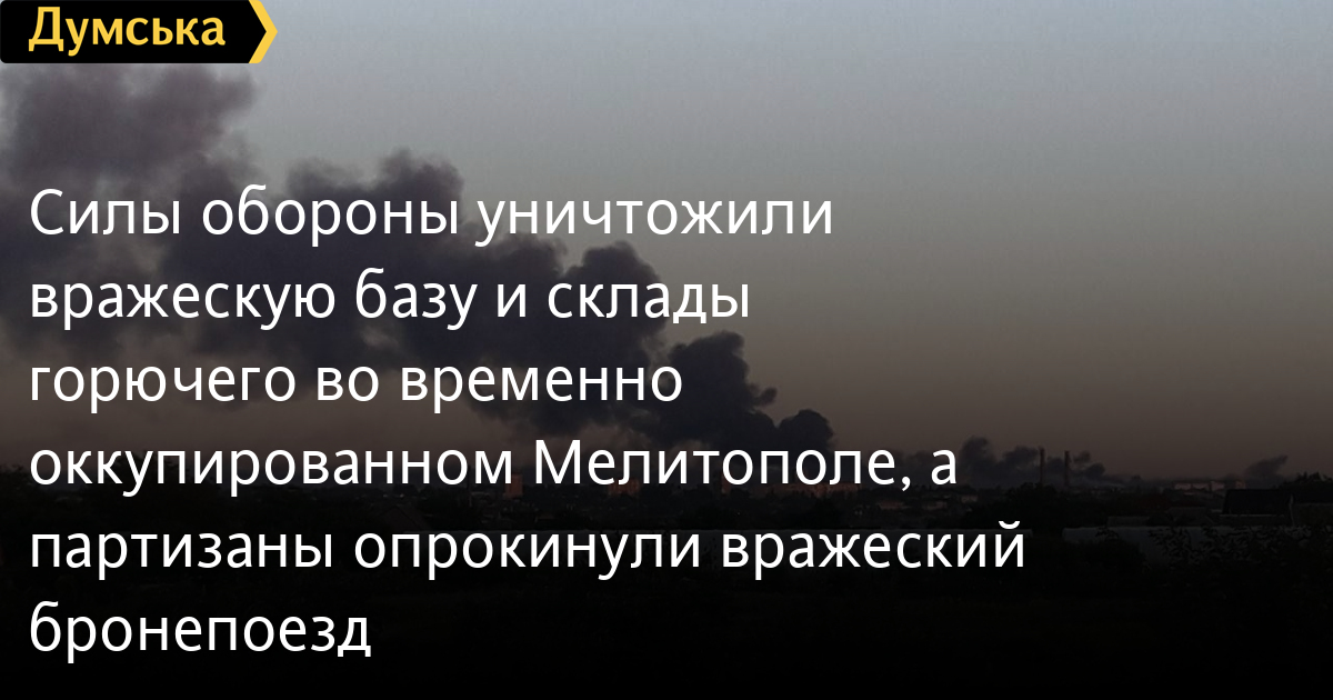 Силы обороны уничтожили вражескую базу и склады горючего во временно оккупированном Мелитополе, а партизаны опрокинули вражеский бронепоездНочью жители временно оккупированного Мелитополя проснулись от громких взрывов, которые можно было сравнить с российским нападением 24 февраля. Мэр временно оккупированного города Иван Федоров сообщил, что в этот раз действовали наши защитники – они нанесли удар по одной из военных баз оккупантов и «сделали так, что теперь она не может функционировать». Также был нанесен удар по складам горюче-смазочных материалов, который россияне организовали на базе военно-транспортной авиации. Два удара были нанесены в 3 и 5 часов ночи. Федоров отметил, что украинские войска били исключительно прицельно и точно, жилые дома и объекты гражданской инфраструктуры не пострадали, жертв среди мирного населения города нет. Кроме того, по словам Федорова, вчера партизаны совершили очередную удачную диверсию на железной дороге – вблизи Мелитополя снова сошел с рельсов вражеский бронепоезд. По словам мэра, бронепоезд опрокинулся и лежит на боку. СМЕРТЬ РОСІЙСЬКИМ ОКУПАНТАМ! Помітили помилку? Виділяйте слова з помилкою та натискайте control-enter |