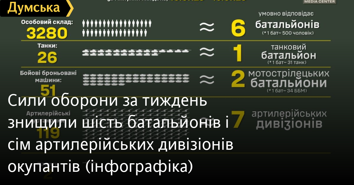 Так, ворог втратив 3280 солдатів і офіцерів (приблизно шість піхотних батальйонів, із розрахунку приблизно 500 осіб на батальйон); 26 танків (у танковому батальйоні 31 танк); 51 бойову броньовану машину (вистачить на два мотострілецькі батальйони); 119 артилерійських систем (в артдивізіоні 18 знарядь) і дві ракети.