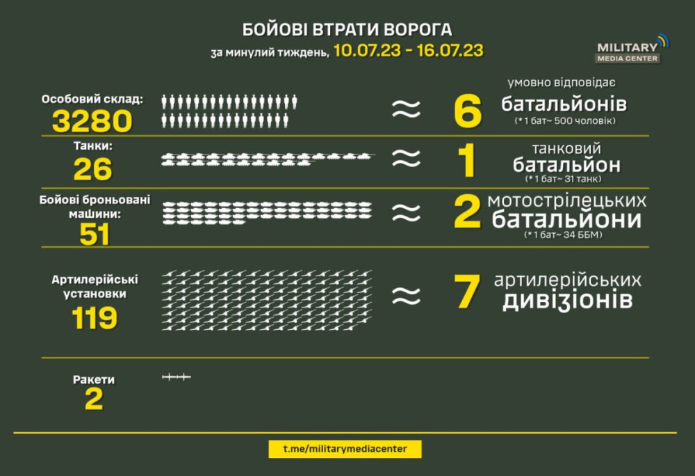 Умовних шість батальйонів піхоти і сім артилерійських дивізіонів противника знищили за минулий тиждень, з 10 по 16 липня, українські захисники.