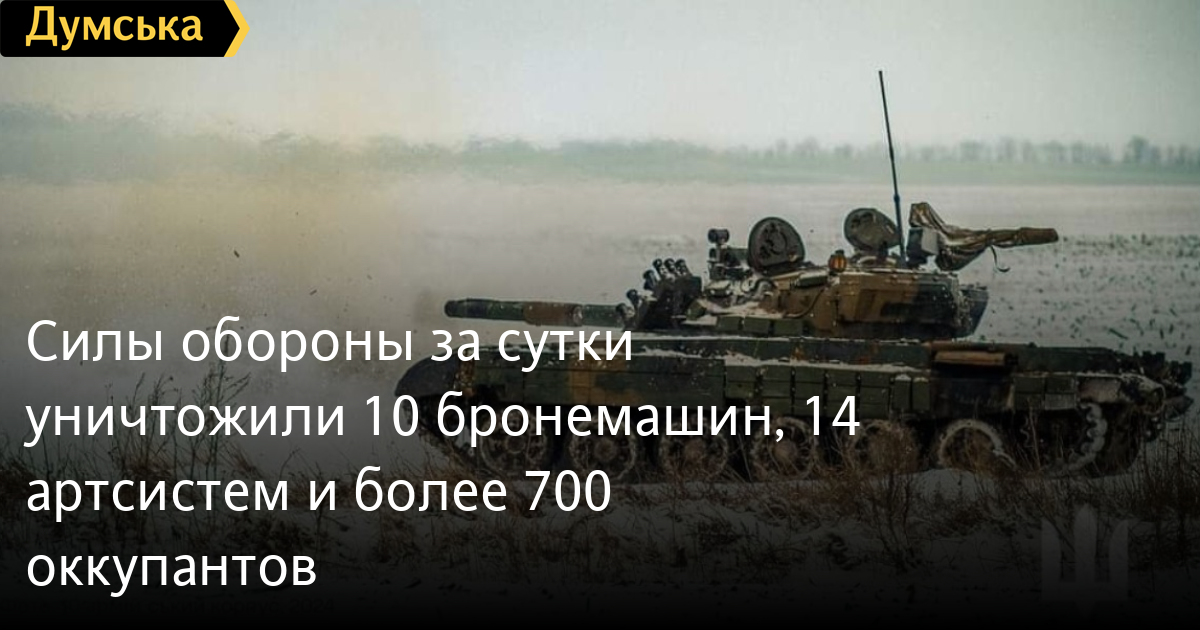 Сили оборони за добу знищили 10 бронемашин,14 артсистем та понад 700 окупантівПонад 700 солдатів і офіцерів, 10 бойових броньованих машин та 14 артилерійських систем втратили російські загарбники минулої доби. За даними Генерального штабу Збройних сил України, наші захисники також знищили 4 танки, РСЗВ, 5 дронів оперативно-тактичного рівня, крилату ракету, 17 одиниць автомобільної техніки та 5 - спецтехніки. Загальні бойові втрати противника з 24.02.22 по 20.01.24 орієнтовно становлять: особового складу — 375 270 (+750) осіб ліквідовано танків — 6171 (+4) бойових броньованих машин — 11 455 (+10) артилерійських систем — 8868 (+14) РСЗВ — 967 (+1) засоби ППО — 654 (0) літаків — 331 (0) гелікоптерів — 324 (0) БПЛА оперативно-тактичного рівня — 6934 (+5) крилаті ракети — 1818 (+1) кораблі / катери — 23 (0) підводні човни — 1 (0) автомобільної техніки та автоцистерн — 11 848 (+17) спеціальна техніка — 1389 (+5) СМЕРТЬ РОСІЙСЬКИМ ОКУПАНТАМ! Помітили помилку? Виділяйте слова з помилкою та натискайте control-enter |