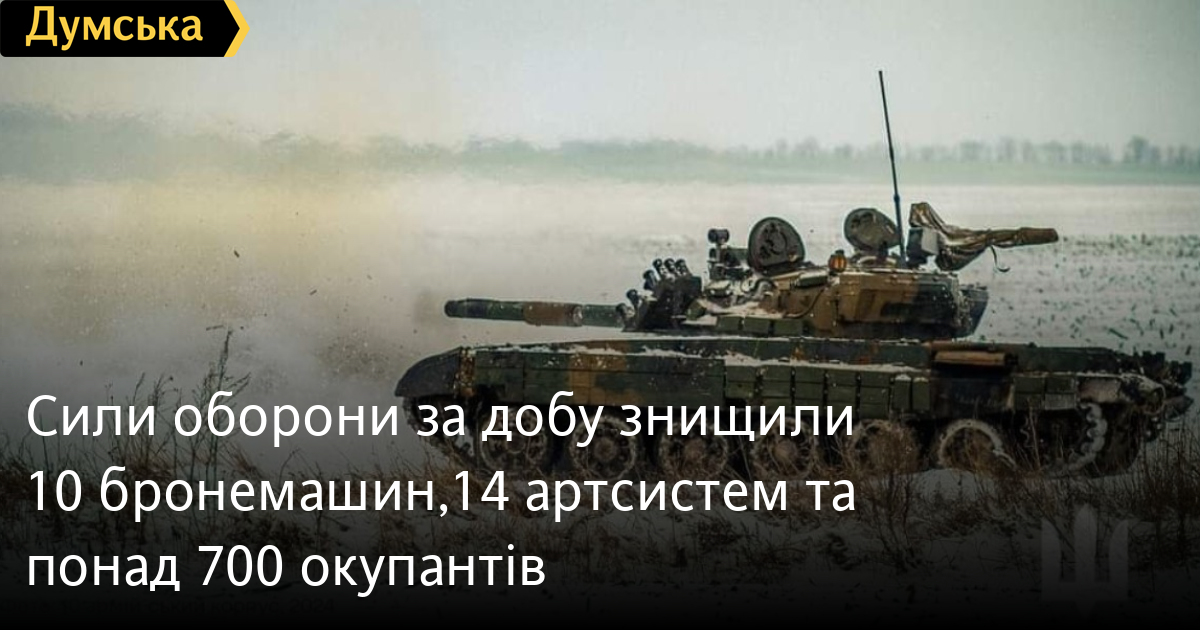 Понад 700 солдатів і офіцерів, 10 бойових броньованих машин та 14 артилерійських систем втратили російські загарбники минулої доби.