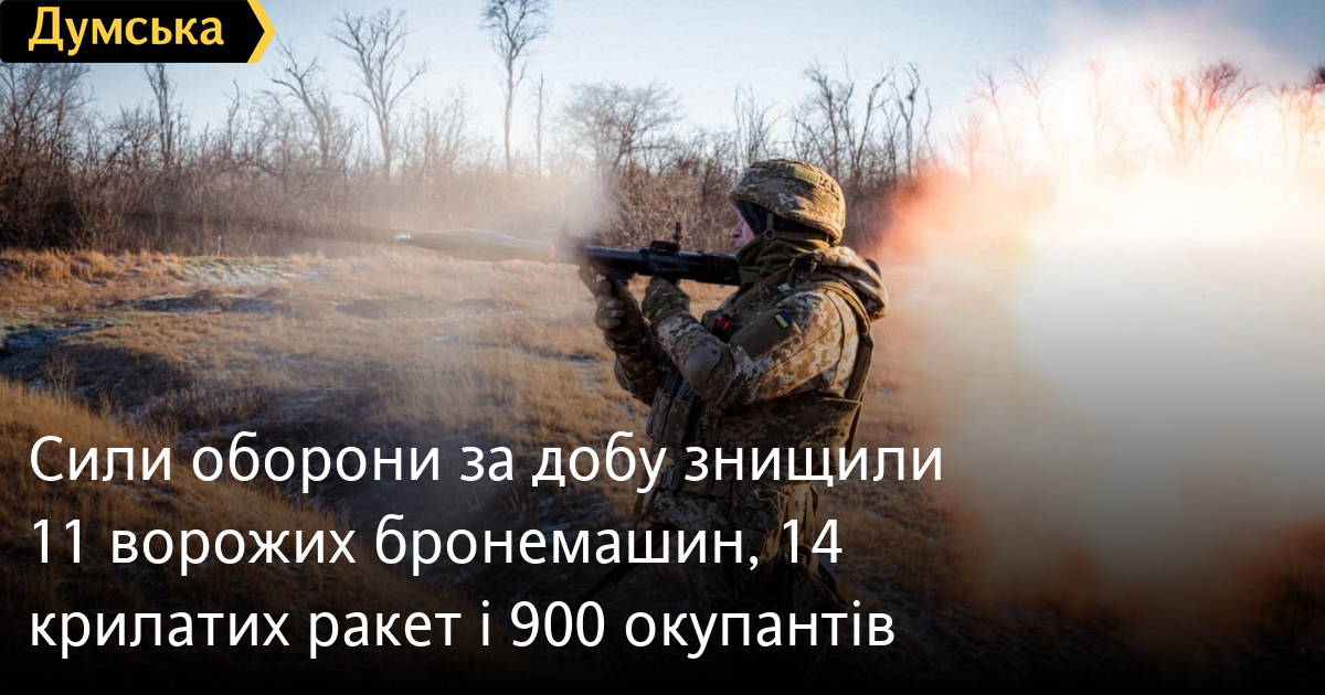 900 солдатів і офіцерів, 11 бойових броньованих машин та 14 крилатих ракет втратили російські загарбники минулої доби.