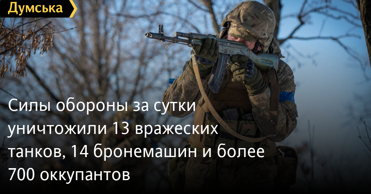 Сили оборони за добу знищили 13 ворожих танків, 14 бронемашин та понад 700 окупантівПонад 700 солдатів і офіцерів, 13 танків та 14 бойових броньованих машин втратили російські загарбники минулої доби. За даними Генерального штабу Збройних сил України, наші захисники також знищили 10 артилерійських систем, три РСЗВ, 7 дронів оперативно-тактичного рівня, крилату ракету, 24 одиниці автомобільної техніки та 2 - спецтехніки. Загальні бойові втрати противника з 24.02.22 по 17.01.24 орієнтовно становлять: особового складу — 372820 (+730) осіб ліквідовано танків — 6126 (+13) бойових броньованих машин — 11372 (+14) артилерійських систем — 8811 (+10) РСЗВ — 964 (+3) засоби ППО — 653 (0) літаків — 331 (0) гелікоптерів — 324 (0) БПЛА оперативно-тактичного рівня — 6884 (+7) крилаті ракети — 1817 (+1) кораблі / катери — 23 (0) підводні човни — 1 (0) автомобільної техніки та автоцистерн — 11755 (+24) спеціальна техніка — 1367 (+2) Дані уточнюються… СМЕРТЬ РОСІЙСЬКИМ ОКУПАНТАМ! Помітили помилку? Виділяйте слова з помилкою та натискайте control-enter |