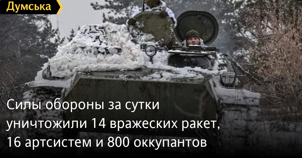 Сили оборони за добу знищили 14 ворожих ракет, 16 артсистем і 800 окупантів800 осіб, 14 крилатих ракет і два танки втратили окупанти в Україні за минулу добу. Крім того, за даними Генерального штабу Збройних сил України, наші захисники також знищили три бойові броньовані машини, 16 артсистем, одну РСЗВ, два засоби ППО, один БПЛА оперативно-тактичного рівня, 20 одиниць автомобільної техніки і дві одиниці спецтехніки. Усього з початку повномасштабного вторгнення втрати ворога склали: особового складу — 141 260 осіб; танків ‒ 3298 одиниць; бойових броньованих машин ‒ 6520 одиниць; артилерійських систем – 2322 одиниці; РСЗВ – 467 одиниць; засоби ППО ‒ 241 одиницю; літаків – 298 одиниць; гелікоптерів – 287 одиниць; БПЛА оперативно-тактичного рівня – 2013; крилаті ракети ‒ 871; кораблі /катери ‒ 18 одиниць; автомобільної техніки та автоцистерн – 5187 одиниць; спеціальна техніка ‒ 221. СМЕРТЬ РОСІЙСЬКИМ ОКУПАНТАМ! Помітили помилку? Виділяйте слова з помилкою та натискайте control-enter |