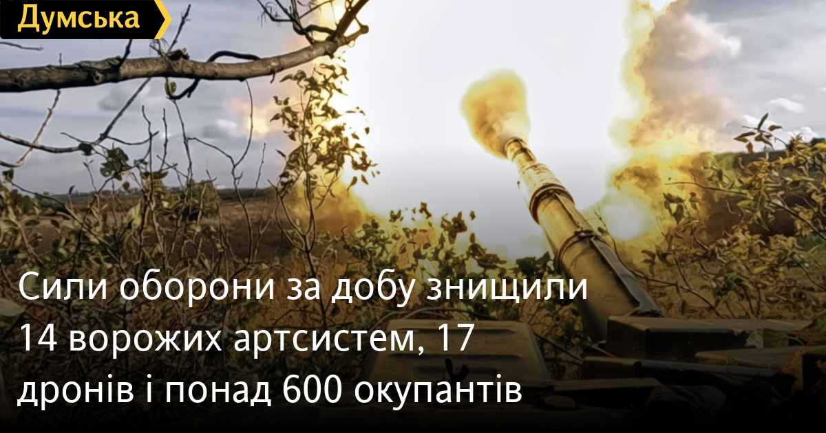 Сили оборони за добу знищили 14 ворожих артсистем, 17 дронів і понад 600 окупантівПонад 600 солдатів і офіцерів, 14 артилерійських систем та 17 дронів оперативно-тактичного рівня втратили російські загарбники минулої доби. За даними Генерального штабу Збройних сил України, наші захисники також знищили 7 танків, 9 бойових броньованих машин, РСЗВ, засіб ППО, 14 одиниць автомобільної техніки та 4 - спецтехніки. Загальні бойові втрати противника з 24.02.22 по 18.11.23 орієнтовно становлять: особового складу ‒ 317380 (+620) осіб ліквідовано танків ‒ 5422 (+7) бойових броньованих машин ‒ 10141 (+9) артилерійських систем ‒ 7726 (+14) РСЗВ ‒ 896 (+1) засоби ППО ‒ 586 (+1) літаків ‒ 323 (0) гелікоптерів ‒ 324 (0) БПЛА оперативно-тактичного рівня ‒ 5726 (+17) крилаті ракети ‒ 1563 (0) кораблі / катери ‒ 22 (0) підводні човни ‒ 1 (0) автомобільної техніки та автоцистерн ‒ 10091 (+14) спеціальна техніка ‒ 1090 (+4) СМЕРТЬ РОСІЙСЬКИМ ОКУПАНТАМ! Помітили помилку? Виділяйте слова з помилкою та натискайте control-enter |