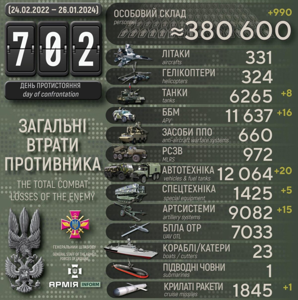 Усього з початку повномасштабного вторгнення втрати ворога склали: