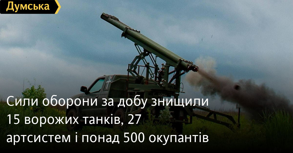 Крім того, за даними Генерального штабу Збройних сил України, наші захисники також знищили 12 бойових броньованих машин, 27 артсистем, два засоби ППО, шість БПЛА оперативно-тактичного рівня, 28 одиниць автомобільної техніки і сім одиниць спецтехніки.