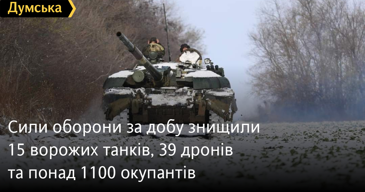 Понад 1100 солдатів і офіцерів, 15 танків та 39 дронів оперативно-тактичного рівня втратили російські загарбники минулої доби.