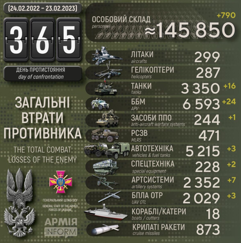 Усього з початку повномасштабного вторгнення втрати ворога склали: