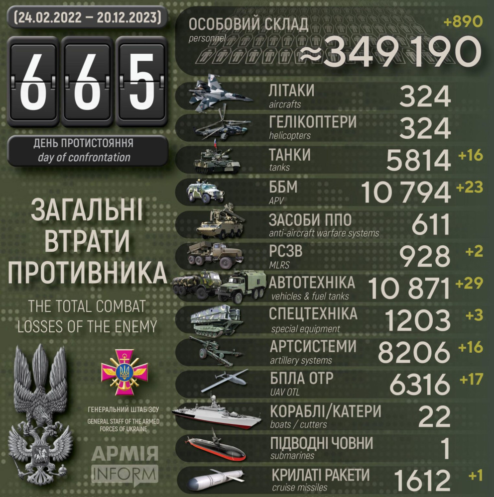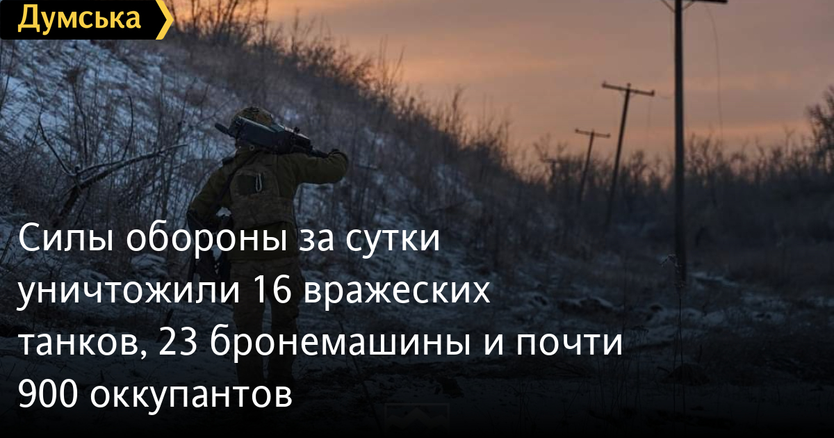 Силы обороны за сутки уничтожили 16 вражеских танков, 23 бронемашины и почти 900 оккупантовПочти 900 солдат и офицеров, 16 танков и 23 боевые бронированные машины потеряли российские захватчики за прошедшие сутки. По данным Генерального штаба Вооруженных сил Украины, наши защитники также уничтожили 16 артиллерийских систем, 2 РСЗО, 17 дронов оперативно-тактического уровня, крылатую ракету, 29 единиц автомобильной техники и единицу спецтехники. Общие боевые потери противника с 24.02.22 по 20.12.23 ориентировочно составляют: личного состава — 349190 (+890) человек ликвидировано танков — 5814 (+16) боевых бронированных машин — 10794 (+23) артиллерийских систем — 8206 (+16) РСЗО — 928 (+2) средства ПВО - 611 (0) самолетов — 324 (0) вертолетов — 324 (0) БПЛА оперативно-тактического уровня — 6316 (+17) крылатые ракеты — 1612 (+1) корабли/катера — 22 (0) подводные лодки — 1 (0) автомобильной техники и автоцистерн — 10871 (+29) специальная техника — 1203 (+3) СМЕРТЬ РОССИЙСКИМ ОККУПАНТАМ! Заметили ошибку? Выделяйте слова с ошибкой и нажимайте control-enter |