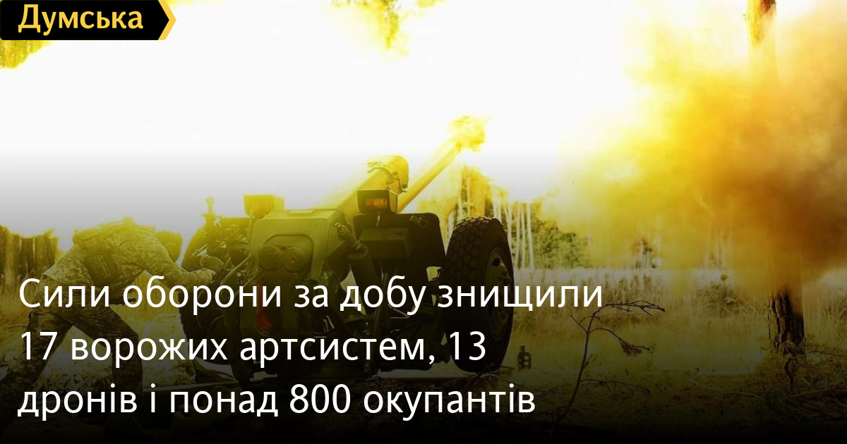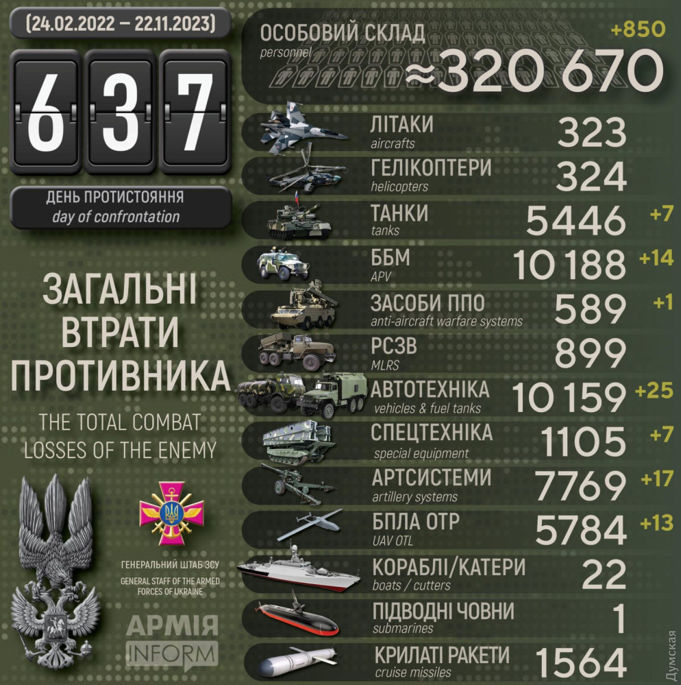 Сили оборони за добу знищили 17 ворожих артсистем, 13 дронів і понад 800 окупантівПонад 800 солдатів і офіцерів, 17 артилерійських систем та 13 дронів оперативно-тактичного рівня втратили російські загарбники минулої доби. За даними Генерального штабу Збройних сил України, наші захисники також знищили 7 танків, 14 бойових броньованих машин, засіб ППО, 25 одиниць автомобільної техніки та 7 - спецтехніки. Загальні бойові втрати противника з 24.02.22 по 22.11.23 орієнтовно становлять: особового складу ‒ 320670 (+850) осіб ліквідовано танків ‒ 5446 (+7) бойових броньованих машин ‒ 10188 (+14) артилерійських систем ‒ 7769 (+17) РСЗВ ‒ 899 (0) засоби ППО ‒ 589 (+1) літаків ‒ 323 (0) гелікоптерів ‒ 324 (0) БПЛА оперативно-тактичного рівня ‒ 5784 (+13) крилаті ракети ‒ 1564 (0) кораблі / катери ‒ 22 (0) підводні човни ‒ 1 (0) автомобільної техніки та автоцистерн ‒ 10159 (+25) спеціальна техніка ‒ 1105 (+7) СМЕРТЬ РОСІЙСЬКИМ ОКУПАНТАМ! Помітили помилку? Виділяйте слова з помилкою та натискайте control-enter |