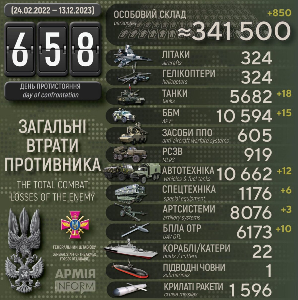 Сили оборони за добу знищили 18 ворожих танків, 15 бронемашин та 850 окупантів850 осіб, 18 танків та три артсистеми втратили російські окупанти минулої доби. Крім того, за даними Генерального штабу Збройних сил України, наші захисники також знищили 15 бойових броньованих машин, десять БПЛА оперативно-тактичного рівня, 12 одиниць автомобільної техніки та шість одиниць спецтехніки. Усього з початку повномасштабного вторгнення втрати ворога склали: особового складу — 341 500 осіб; танків ‒ 5682 одиниці; бойових броньованих машин ‒ 10594 одиниці; артилерійських систем – 8076 одиниць; РСЗВ – 919 одиниць; засоби ППО ‒ 605 одиниць; літаків – 324 одиниці; гелікоптерів – 324 одиниці; БПЛА оперативно-тактичного рівня – 6173; крилаті ракети ‒ 1596; кораблі /катери ‒ 22 одиниці; підводні човни — 1 одиницю; автомобільної техніки та автоцистерн – 10662 одиниці; спеціальна техніка ‒ 1176. СМЕРТЬ РОСІЙСЬКИМ ОКУПАНТАМ! Помітили помилку? Виділяйте слова з помилкою та натискайте control-enter |