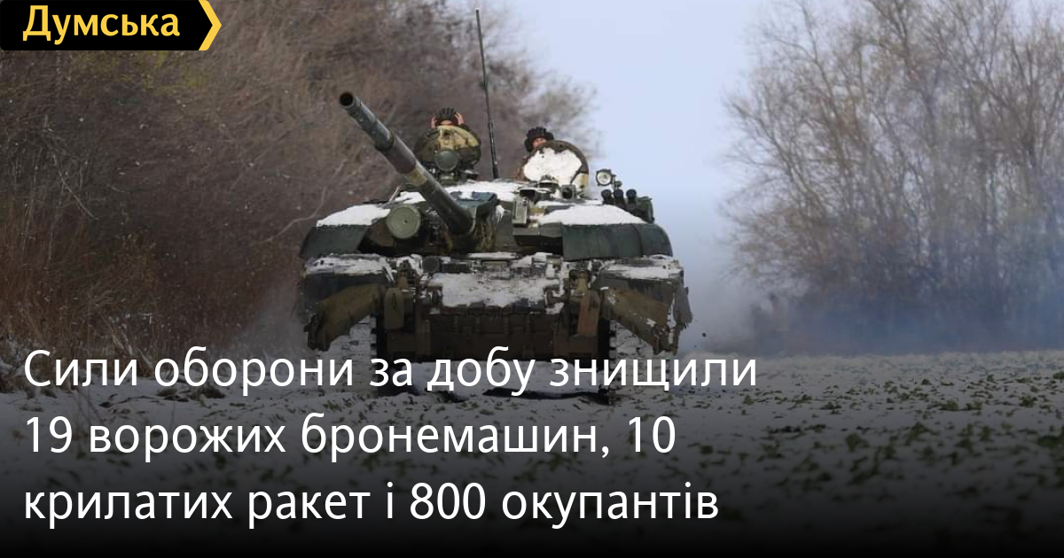 Сили оборони за добу знищили 19 ворожих бронемашин, 10 крилатих ракет і 800 окупантів800 солдатів і офіцерів, 19 бойових броньованих машин та 10 крилатих ракет втратили російські загарбники минулої доби. За даними Генерального штабу Збройних сил України, наші захисники також знищили 9 танків, 3 артилерійські системи, 9 дронів оперативно-тактичного рівня та 14 одиниць автомобільної техніки та дві - спецтехніки. Загальні бойові втрати противника з 24.02.22 по 12.12.23 орієнтовно становлять: особового складу ‒ 340650 (+800) осіб ліквідовано танків ‒ 5664 (+9) бойових броньованих машин ‒ 10579 (+19) артилерійських систем ‒ 8073 (+3) РСЗВ ‒ 919 (0) засоби ППО ‒ 605 (0) літаків ‒ 324 (0) гелікоптерів ‒ 324 (0) БПЛА оперативно-тактичного рівня ‒ 6163 (+9) крилаті ракети ‒ 1596 (+10) кораблі / катери ‒ 22 (0) підводні човни ‒ 1 (0) автомобільної техніки та автоцистерн ‒ 10650 (+14) спеціальна техніка ‒ 1170 (+2) СМЕРТЬ РОСІЙСЬКИМ ОКУПАНТАМ! Помітили помилку? Виділяйте слова з помилкою та натискайте control-enter |