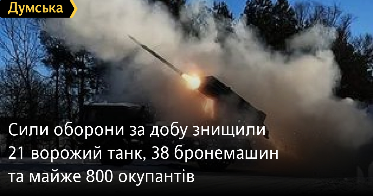 Майже 800 солдатів і офіцерів, 21 танк та 38 бойових броньованих машин втратили російські загарбники минулої доби.