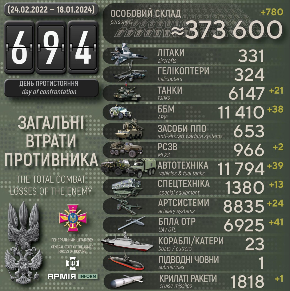 Загальні бойові втрати противника з 24.02.22 по 18.01.24 орієнтовно становлять: