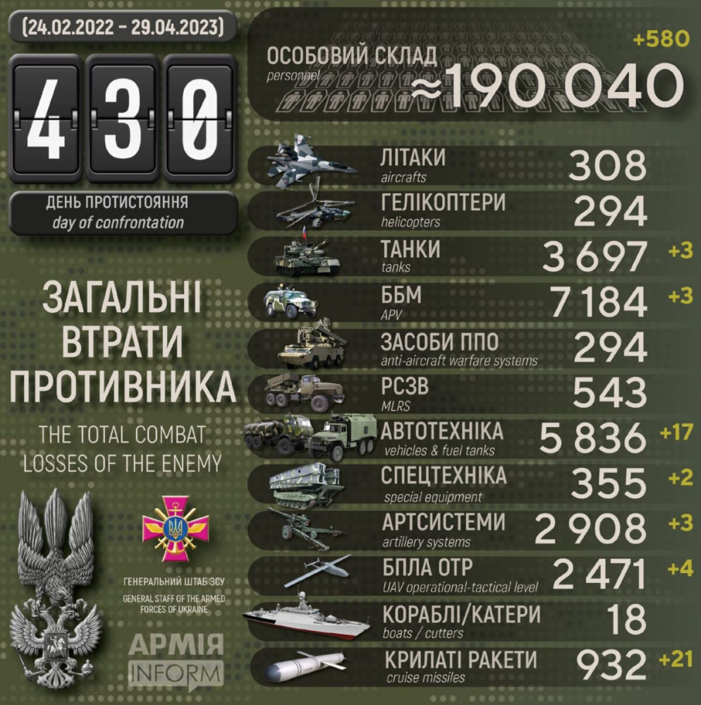 Крім того, за даними Генерального штабу Збройних сил України, наші захисники також знищили три бойові броньовані машини, три артсистеми, чотири БПЛА оперативно-тактичного рівня, 17 одиниць автомобільної техніки і дві одиниці спецтехніки.