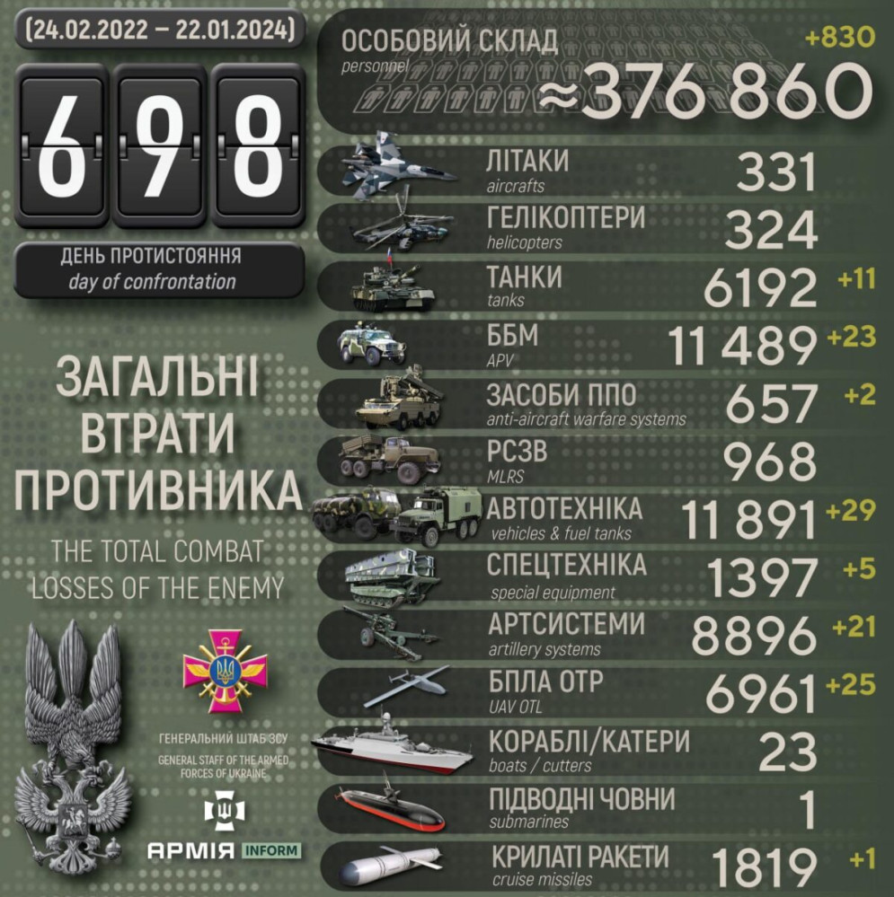 Усього з початку повномасштабного вторгнення втрати ворога склали:
