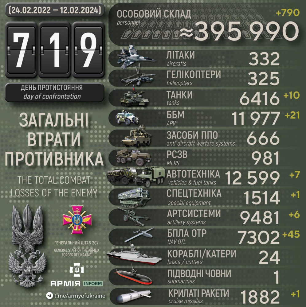 Загальні бойові втрати противника з 24.02.22 по 12.02.24 орієнтовно становлять: