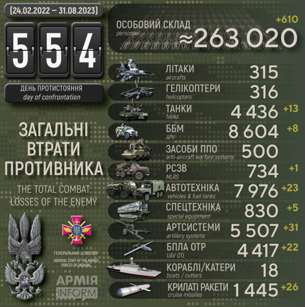 Сили оборони за добу знищили 26 ворожих ракет, 31 артсистему і понад 600 окупантів610 осіб, 26 крилатих ракет і 13 танків втратили окупанти в Україні за минулу добу. Крім того, за даними Генерального штабу Збройних сил України, наші захисники також знищили вісім бойових броньованих машин, 31 артсистему, одну РСЗВ, 22 БПЛА оперативно-тактичного рівня, 23 одиниці автомобільної техніки і п'ять одиниць спецтехніки. Усього з початку повномасштабного вторгнення втрати ворога склали: особового складу — 263 020 осіб; танків ‒ 4436 одиниць; бойових броньованих машин — 8604 одиниці; артилерійських систем – 5507 одиниць; РСЗВ – 734 одиниці; засоби ППО ‒ 500 одиниць; літаків — 315 одиниць; гелікоптерів – 316 одиниць; БПЛА оперативно-тактичного рівня – 4417; крилаті ракети ‒ 1445; кораблі /катери ‒ 18 одиниць; автомобільної техніки та автоцистерн – 7976 одиниць; спеціальна техніка ‒ 830. СМЕРТЬ РОСІЙСЬКИМ ОКУПАНТАМ! Помітили помилку? Виділяйте слова з помилкою та натискайте control-enter |