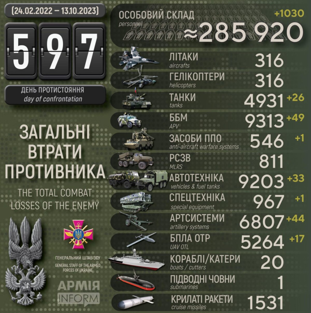 Крім того, за даними Генерального штабу Збройних сил України, наші захисники також знищили 49 бойових броньованих машин, один засіб ППО, 17 БПЛА оперативно-тактичного рівня, 33 одиниці автомобільної техніки та одну одиницю спецтехніки.