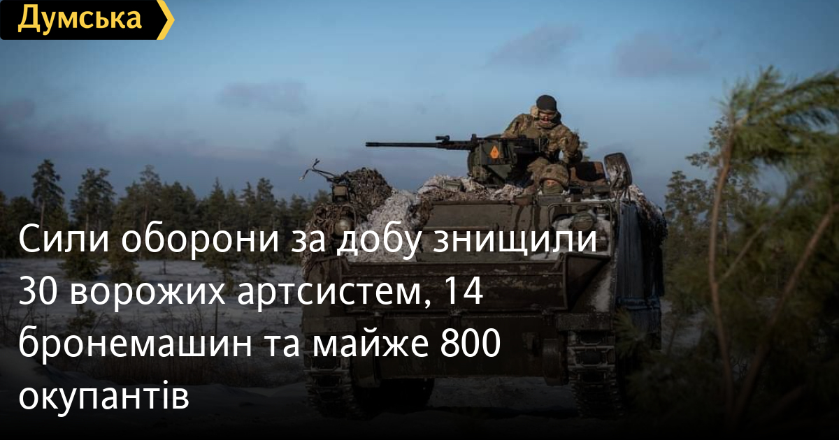 Майже 800 солдатів і офіцерів, 30 артилерійських систем та 14 бойових броньованих машин втратили російські загарбники минулої доби.