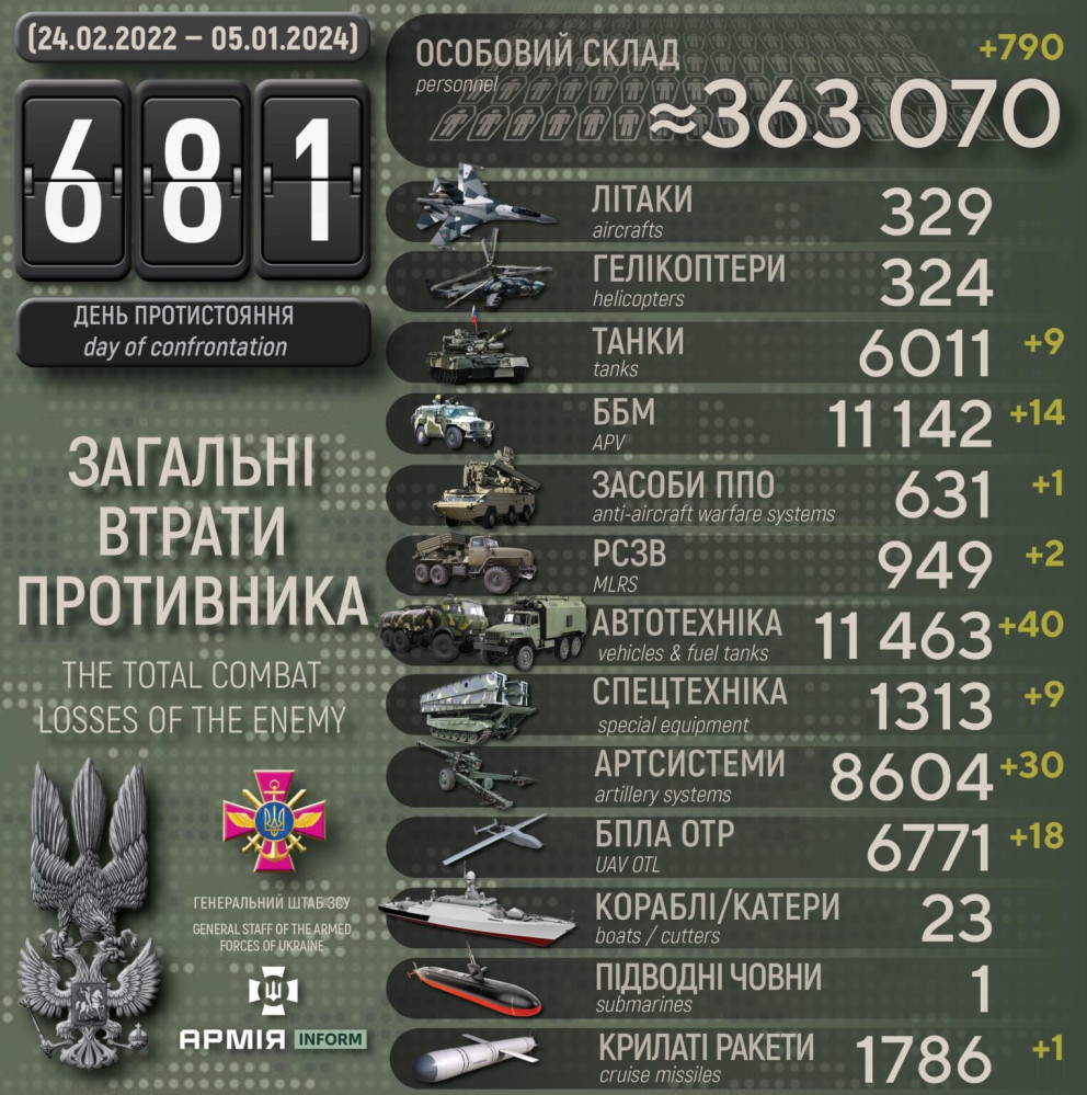 Загальні бойові втрати противника з 24.02.22 по 05.01.24 орієнтовно становлять: