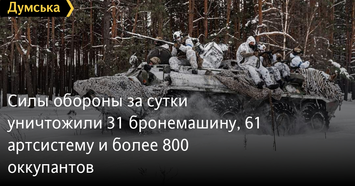 Сили оборони за добу знищили 31 бронемашину, 61 артсистему та понад 800 окупантівПонад 800 солдатів і офіцерів, 31 бойову броньовану машину та 61 артилерійську систему втратили російські загарбники минулої доби. За даними Генерального штабу Збройних сил України, наші захисники також знищили 13 танків, РСЗВ, 2 засоби ППО, 37 дронів оперативно-тактичного рівня, 22 крилаті ракети, 49 одиниць автомобільної техніки та 7 - спецтехніки. Загальні бойові втрати противника з 24.02.22 по 24.01.24 орієнтовно становлять: особового складу ‒ 378660 (+840) осіб ліквідовано танків ‒ 6227 (+13) бойових броньованих машин ‒ 11579 (+31) артилерійських систем ‒ 9008 (+61) РСЗВ ‒ 971 (+1) засоби ППО ‒ 659 (+2) літаків ‒ 331 (0) гелікоптерів ‒ 324 (0) БПЛА оперативно-тактичного рівня ‒ 6998 (+37) крилаті ракети ‒ 1842 (+22) кораблі / катери ‒ 23 (0) підводні човни ‒ 1 (0) автомобільної техніки та автоцистерн ‒ 12005 (+49) спеціальна техніка ‒ 1416 (+7). СМЕРТЬ РОСІЙСЬКИМ ОКУПАНТАМ! Помітили помилку? Виділяйте слова з помилкою та натискайте control-enter |