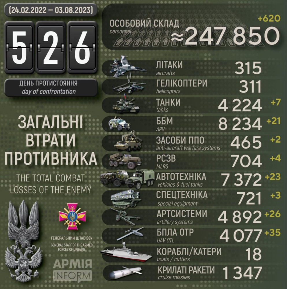 Крім того, за даними Генерального штабу Збройних сил України, наші захисники також знищили 21 бойову броньовану машину, чотири РСЗВ, два засоби ППО, 35 БПЛА оперативно-тактичного рівня, 23 одиниці автомобільної техніки і три одиниці спецтехніки.