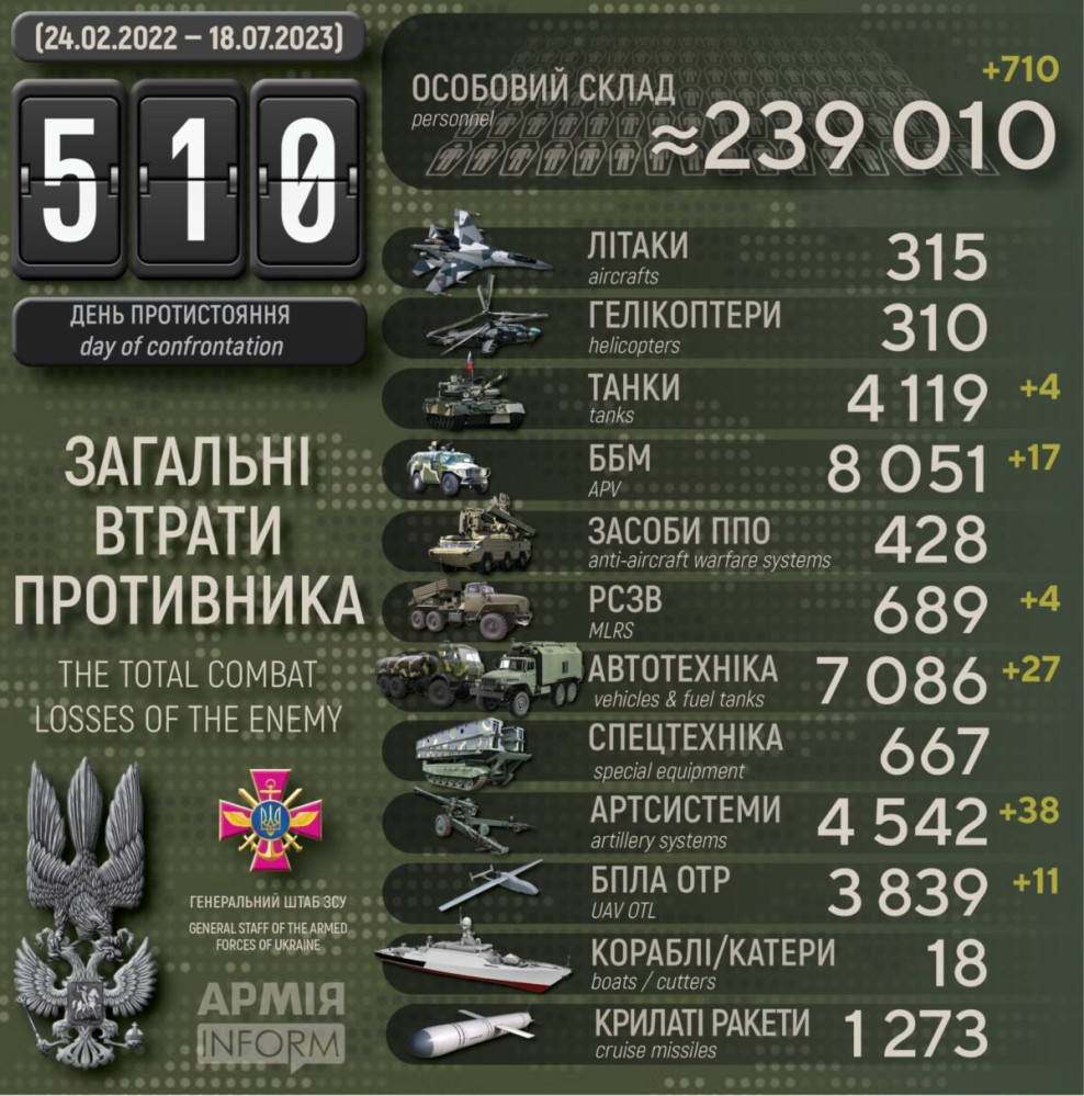 Крім того, за даними Генерального штабу Збройних сил України, наші захисники також знищили 17 бойових броньованих машин, чотири РСЗВ, 11 БПЛА оперативно-тактичного рівня і 27 одиниць автомобільної техніки.