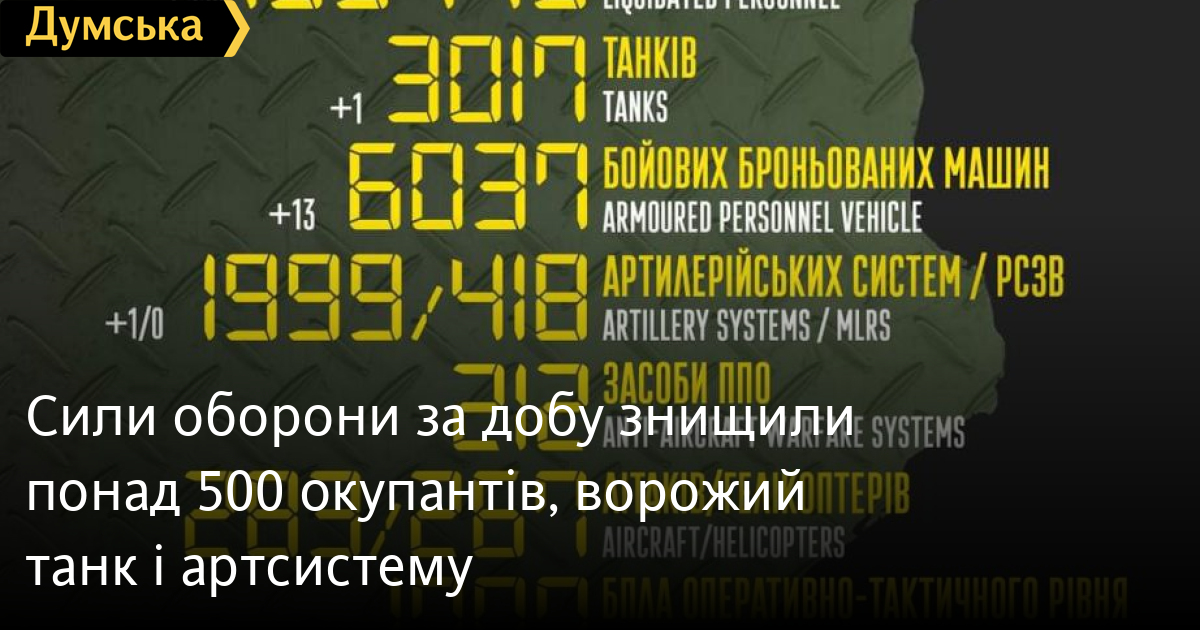 Також повідомляється про знищений ворожий танк, артилерійську систему, 13 бойових броньованих машин і вісім одиниць автотехніки.
