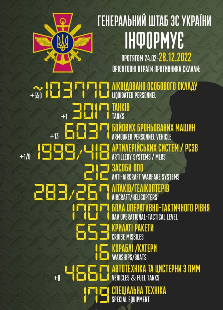 Загалом від початку повномасштабного вторгнення втрати ворога склали 103 770 військовослужбовців.