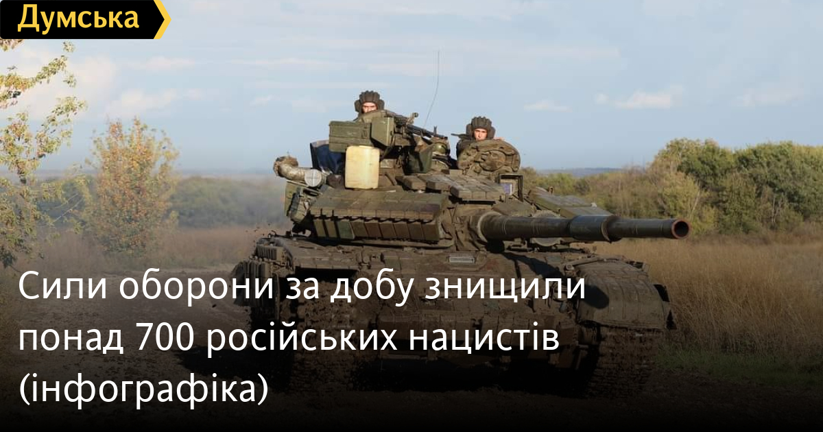 Як повідомляє Генштаб Збройних сил, за минулу добу українські захисники ліквідували приблизно 710 російських солдатів і офіцерів, десять танків, 14 бойових броньованих машин, 12 артсистем, гелікоптер, шість БПЛА оперативно-тактичного рівня, 17 одиниць автомобільної техніки та автоцистерн.