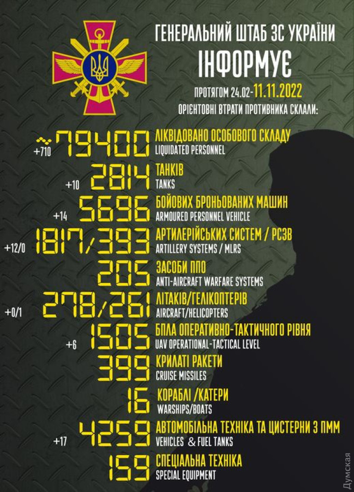 Загалом із 24 лютого 2022 року окупанти втратили 79400 осіб, 2814 танків, 5696 ББМ, 1817 артсистем, 393 РСЗВ, 205 засобів ППО, 278 літаків, 261 гелікоптер, 1505 БПЛА, 399 крилатих ракет, 16 кораблів і катерів, 4259 одиниць автотехніки та автоцистерн, 159 одиниць спеціальної техніки.