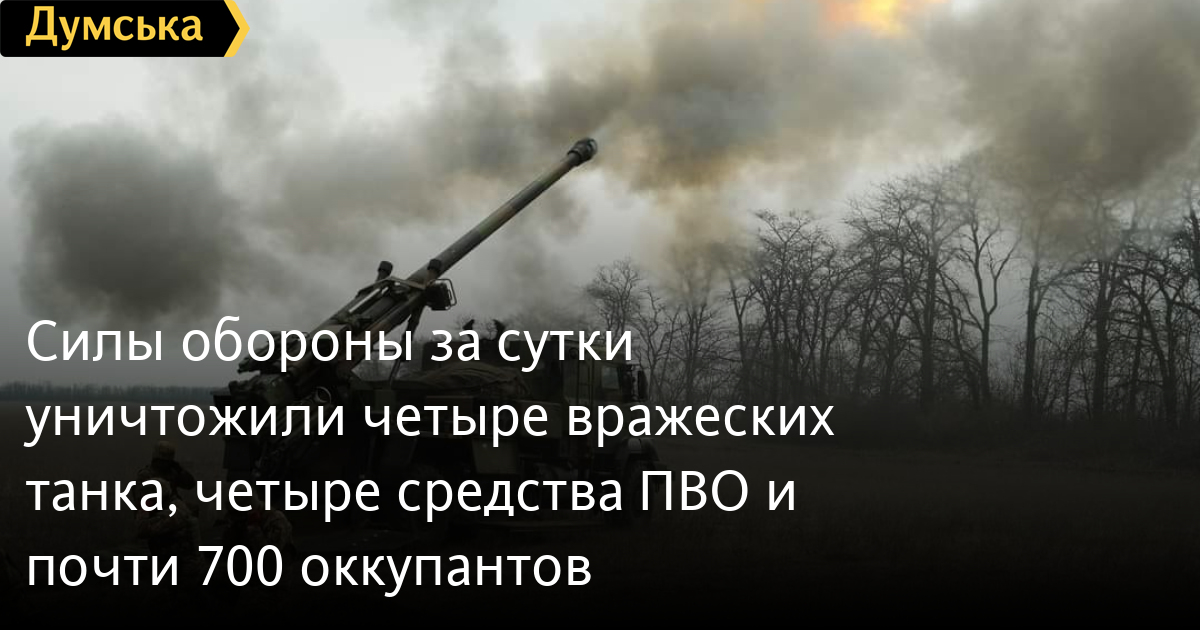 Сили оборони за добу знищили чотири ворожі танки, чотири засоби ППО і майже 700 окупантів680 осіб, чотири танки і п'ять артсистем втратили окупанти в Україні за минулу добу. Крім того, за даними Генерального штабу Збройних сил України, наші захисники також знищили чотири бойові броньовані машини, чотири засоби ППО, чотири БПЛА оперативно-тактичного рівня, п'ять одиниць автомобільної техніки і три одиниці спецтехніки. Усього з початку повномасштабного вторгнення втрати ворога склали: особового складу — 185 730 осіб; танків ‒ 3672 одиниці; бойових броньованих машин ‒ 7130 одиниць; артилерійських систем – 2832 одиниці; РСЗВ – 539 одиниць; засоби ППО ‒ 289 одиниць; літаків – 308 одиниць; гелікоптерів – 293 одиниці; БПЛА оперативно-тактичного рівня – 2398; крилаті ракети ‒ 911; кораблі /катери ‒ 18 одиниць; автомобільної техніки та автоцистерн – 5718 одиниць; спеціальна техніка ‒ 337. СМЕРТЬ РОСІЙСЬКИМ ОКУПАНТАМ! Помітили помилку? Виділяйте слова з помилкою та натискайте control-enter |