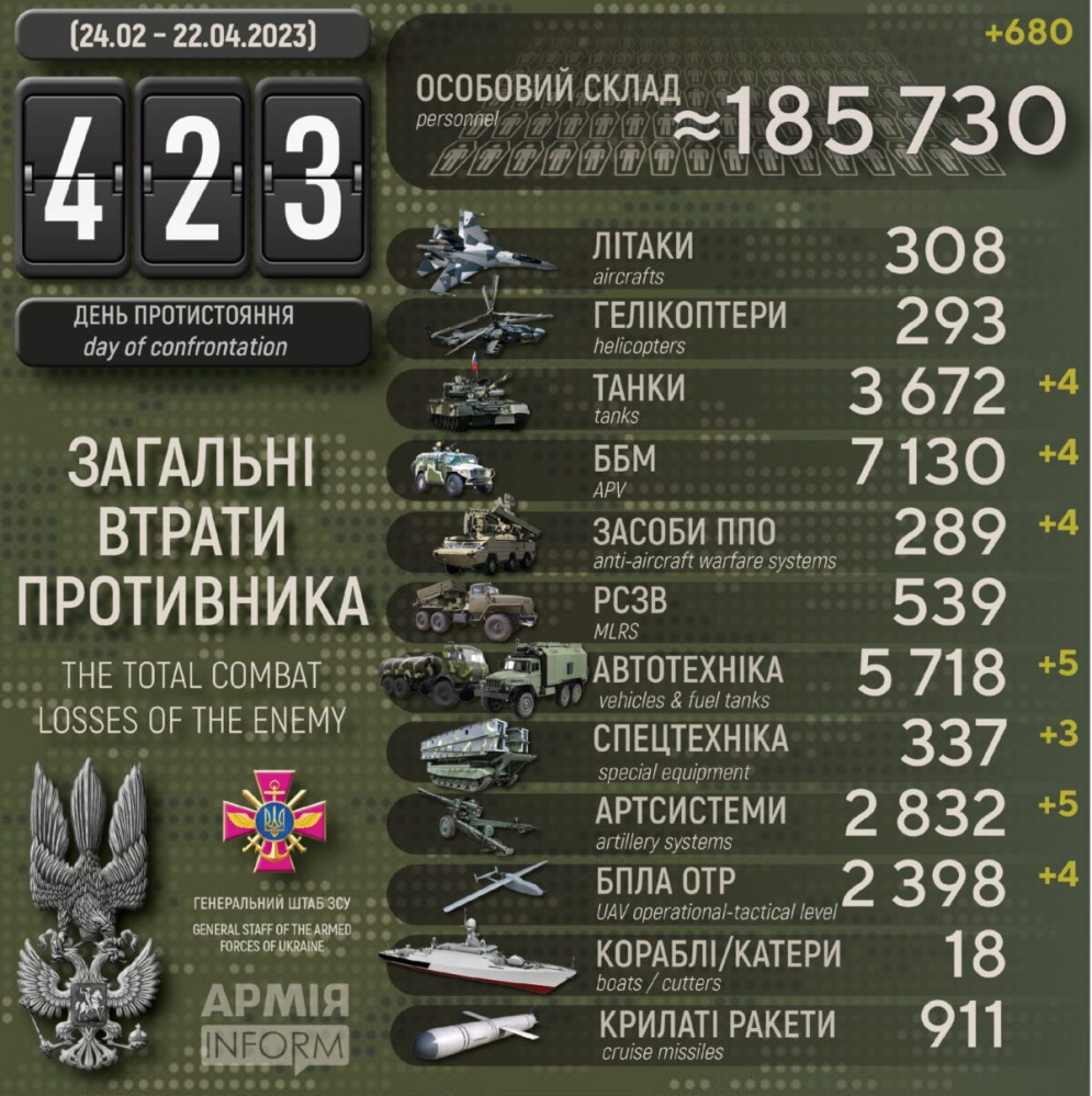 Крім того, за даними Генерального штабу Збройних сил України, наші захисники також знищили чотири бойові броньовані машини, чотири засоби ППО, чотири БПЛА оперативно-тактичного рівня, п'ять одиниць автомобільної техніки і три одиниці спецтехніки.