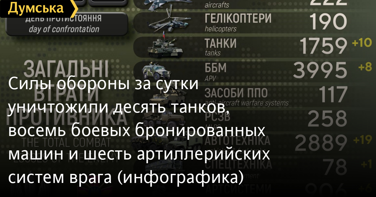 Сили оборони за добу знищили десять танків, вісім бойових броньованих машин та шість артилерійських систем ворога (інфографіка)Десять танків, вісім бойових броньованих машин та шість артилерійських систем втратили загарбники минулої доби в Україні. Вбито або потрапило у полон 170 російських нацистів, повідомляють у Генштабі Збройних сил. Загальні бойові втрати противника з 24.02 по 30.07 орієнтовно склали: особового складу – близько 40670 (+170) осіб, танків ‒ 1759 (+10) од, бойових броньованих машин ‒ 3995 (+8) од, артилерійських систем – 906 (+6) од, РСЗВ – 258 (+0) од, засоби ППО – 117 (+0) од, літаків – 222 (+0) од, гелікоптерів – 190 (+0) од, БПЛА оперативно-тактичного рівня – 733 (+2), крилаті ракети – 174 (+0), кораблі / катери – 15 (+0) од, автомобільної техніки та автоцистерн – 2889 (+19) од, спеціальна техніка – 78 (+1). Найбільших втрат противник зазнав на донецькому напрямку. Дані уточнюються. СМЕРТЬ РОСІЙСЬКИМ ОКУПАНТАМ! Помітили помилку? Виділяйте слова з помилкою та натискайте control-enter |