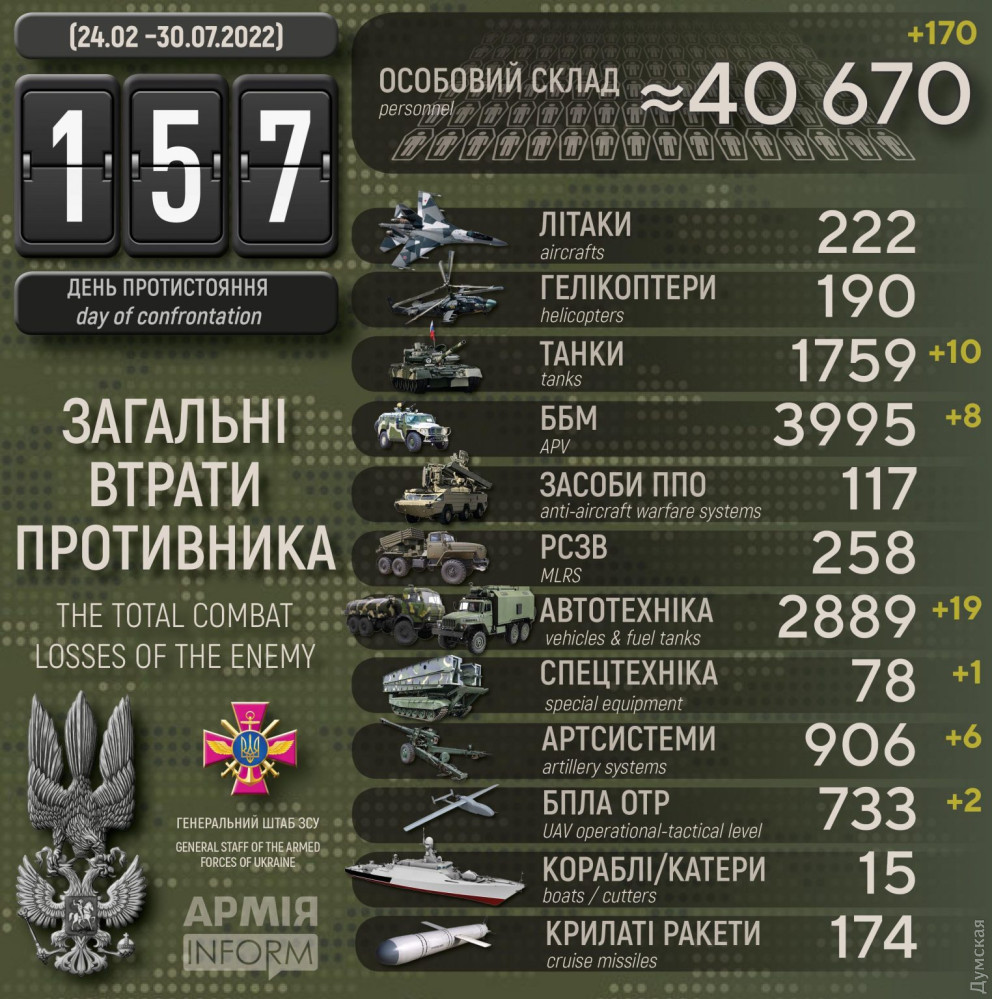 Загальні бойові втрати противника з 24.02 по 30.07 орієнтовно склали: