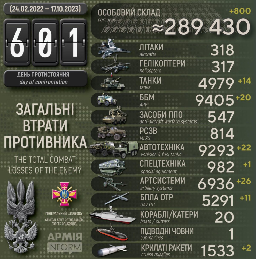 Крім того, за даними Генерального штабу Збройних сил України, наші захисники також знищили 26 артсистем, 20 бойових броньованих машин, 11 БПЛА оперативно-тактичного рівня, 22 одиниці автомобільної техніки та одну одиницю спецтехніки.