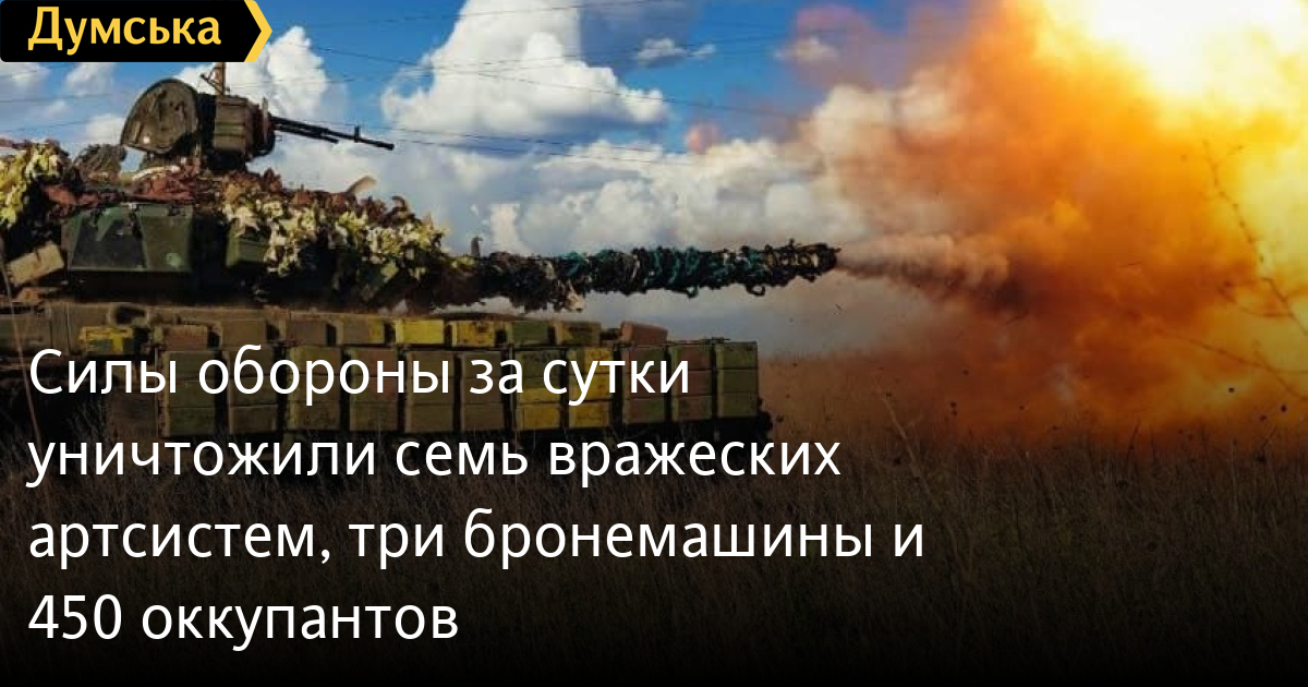 Сили оборони за добу знищили сім ворожих артсистем, три бронемашини і 450 окупантів450 осіб, один танк і сім артсистем втратили окупанти в Україні за минулу добу. Крім того, за даними Генерального штабу Збройних сил України, наші захисники також знищили три бойові броньовані машини, один БПЛА оперативно-тактичного рівня, три одиниці автомобільної техніки і дві одиниці спецтехніки. Усього з початку повномасштабного вторгнення втрати ворога склали: особового складу — 190 960 осіб; танків ‒ 3700 одиниць; бойових броньованих машин ‒ 7192 одиниці; артилерійських систем – 2921 одиницю; РСЗВ – 544 одиниці; засоби ППО ‒ 295 одиниць; літаків – 308 одиниць; гелікоптерів – 294 одиниці; БПЛА оперативно-тактичного рівня – 2476; крилаті ракети ‒ 932; кораблі /катери ‒ 18 одиниць; автомобільної техніки та автоцистерн – 5845 одиниць; спеціальна техніка ‒ 359. СМЕРТЬ РОСІЙСЬКИМ ОКУПАНТАМ! Помітили помилку? Виділяйте слова з помилкою та натискайте control-enter |