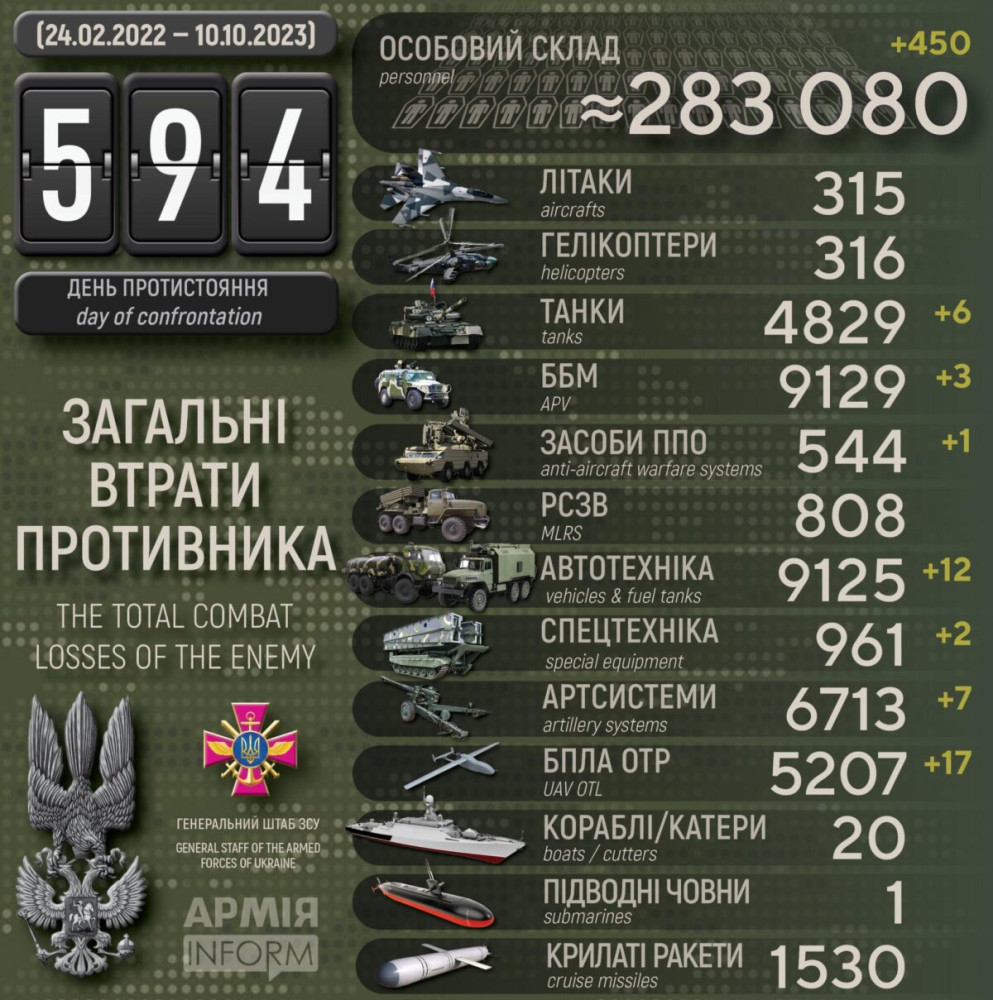 Усього з початку повномасштабного вторгнення втрати ворога склали: