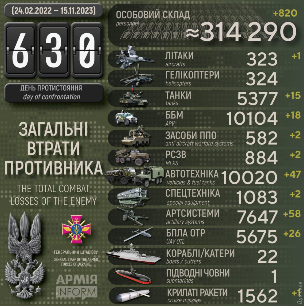 Загальні бойові втрати противника з 24.02.22 по 15.11.23 орієнтовно становлять: