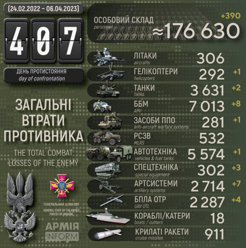 Крім того, за даними Генерального штабу Збройних сил України, наші захисники також знищили вісім бойових броньованих машин, сім артсистем, один засіб ППО, чотири БПЛА оперативно-тактичного рівня, одну одиницю автомобільної техніки і три одиниці спецтехніки.